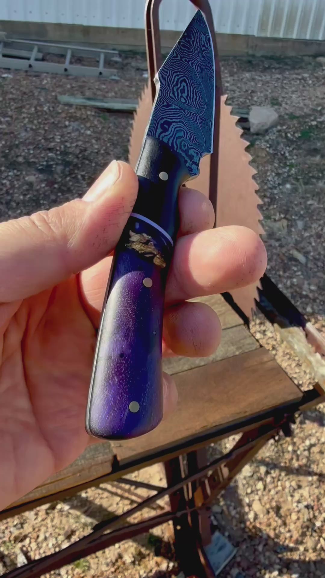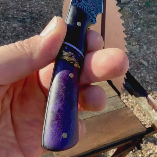 100 layer Damascus version of my “Wildling” design. This handle screams class with the dark purple tones. The Damascus blade is forged from 100 layers of 80crv2 and 15n20. Comes with a leather sheath fixed with an ulticlip for pocket carry as well as a clip on belt loop.